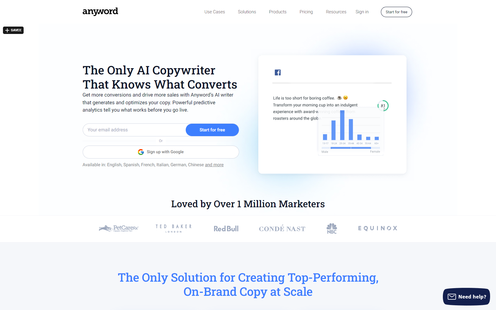 Anyword uses predictive analytics to create and optimize marketing copy for various channels. It analyzes billions of data points to provide insights that help you pick the right words for the right audience with minimal guesswork.