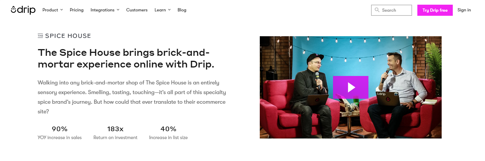 Furthermore, Drip gives specific examples of how their software has helped companies achieve significant results. For instance, the company grow online sales by 90% by using Drip’s software. These stats are clear and straightforward and instantly convey the message.