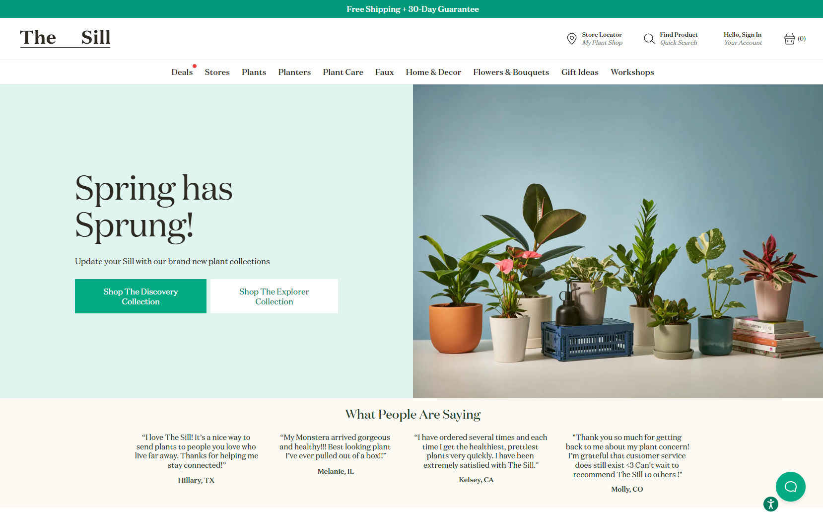 The Sill is an ecommerce website that sells plants and accessories, and their website is visually cohesive and easy to navigate. Visitors can find information about plant care, upcoming events, and purchase plants without any difficulty.